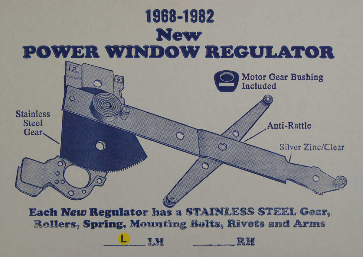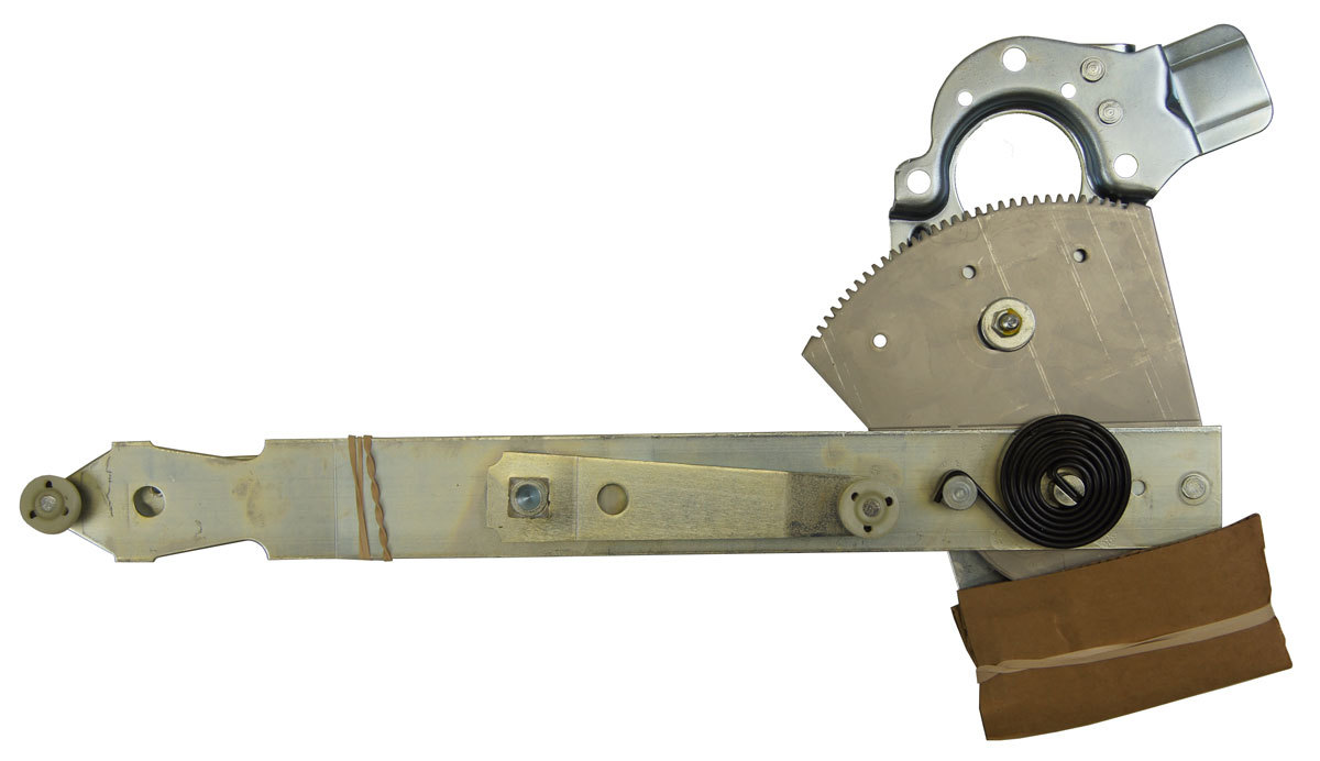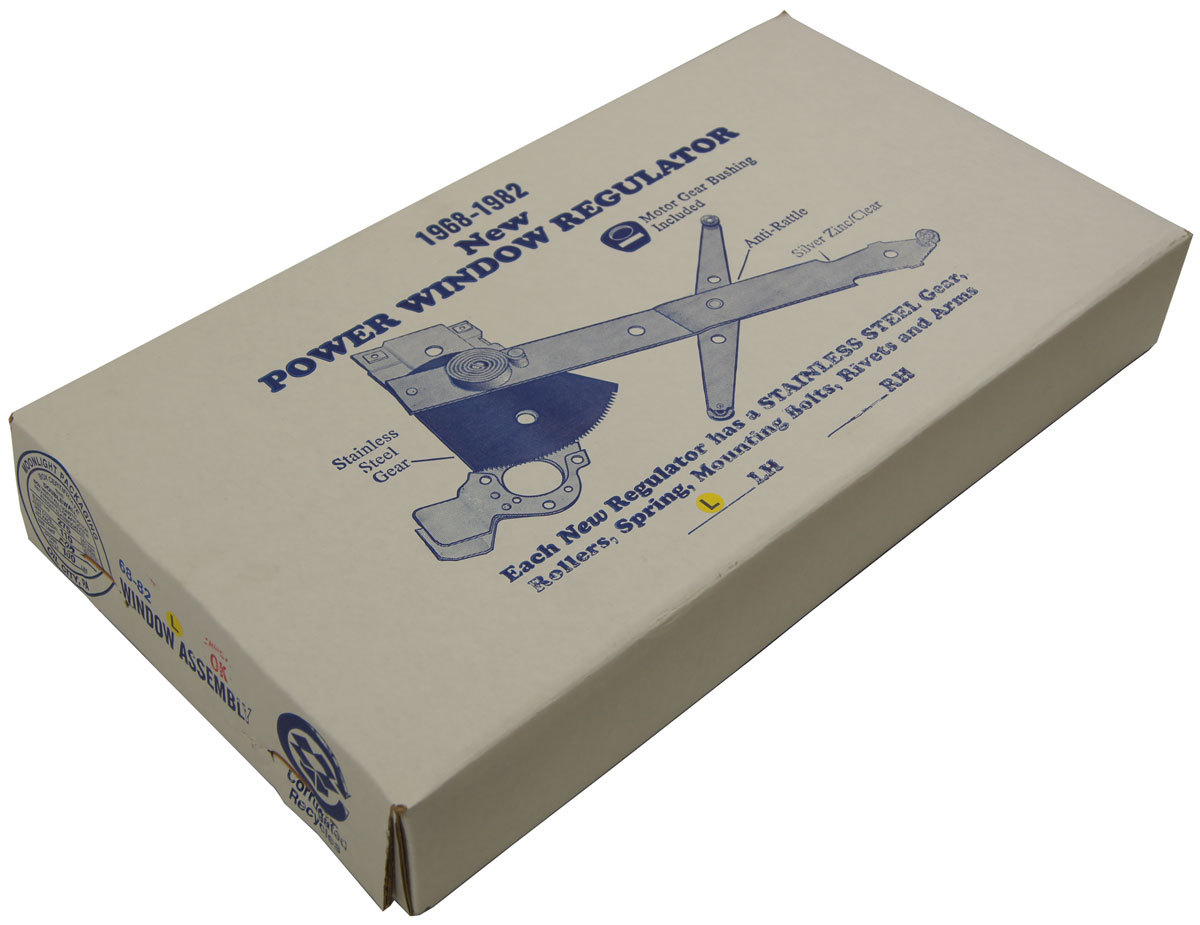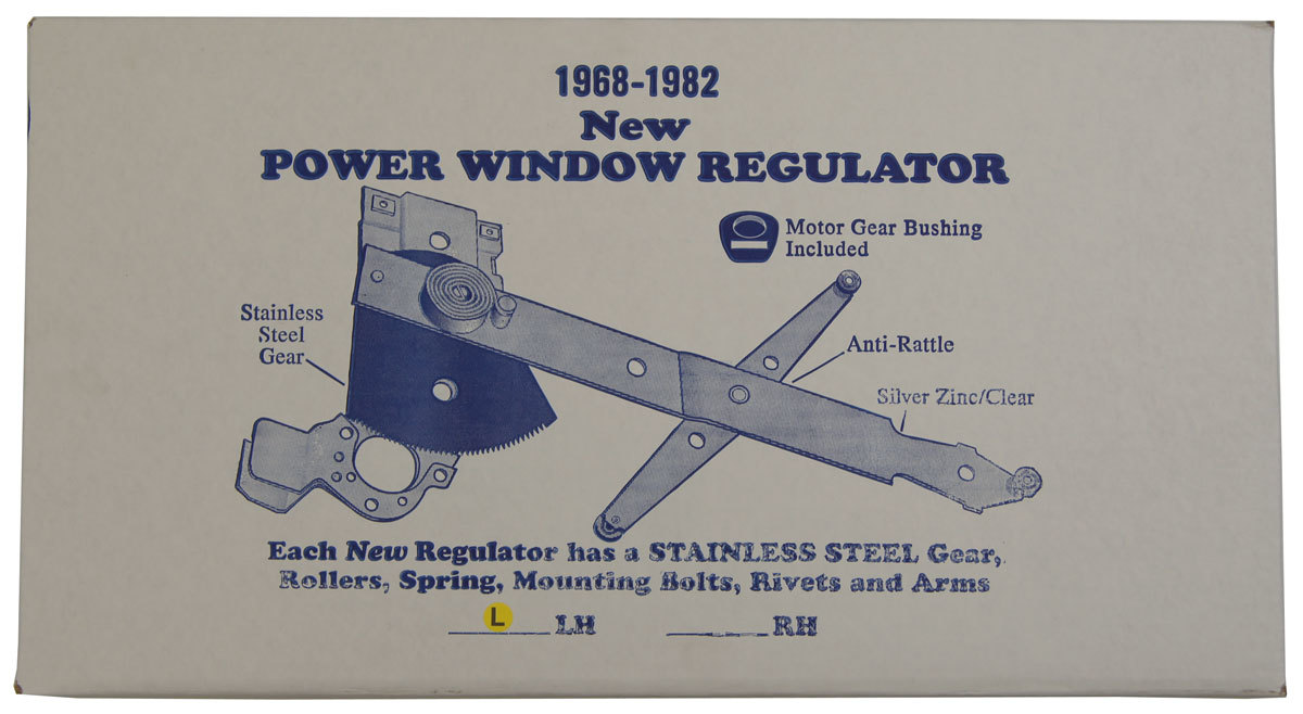 This is the left side (LH) power window regulator for 1968-1982 Chevrolet Corvette C3 vehicles. This item was made in the USA and is brand new in the box. This regulator comes with a new stainless steel gear, rollers, spring, mounting bolts, rivets, and arms. This also includes the motor gear bushing. Replace your broken window regulator with this brand new unit and have your window working like new again!
