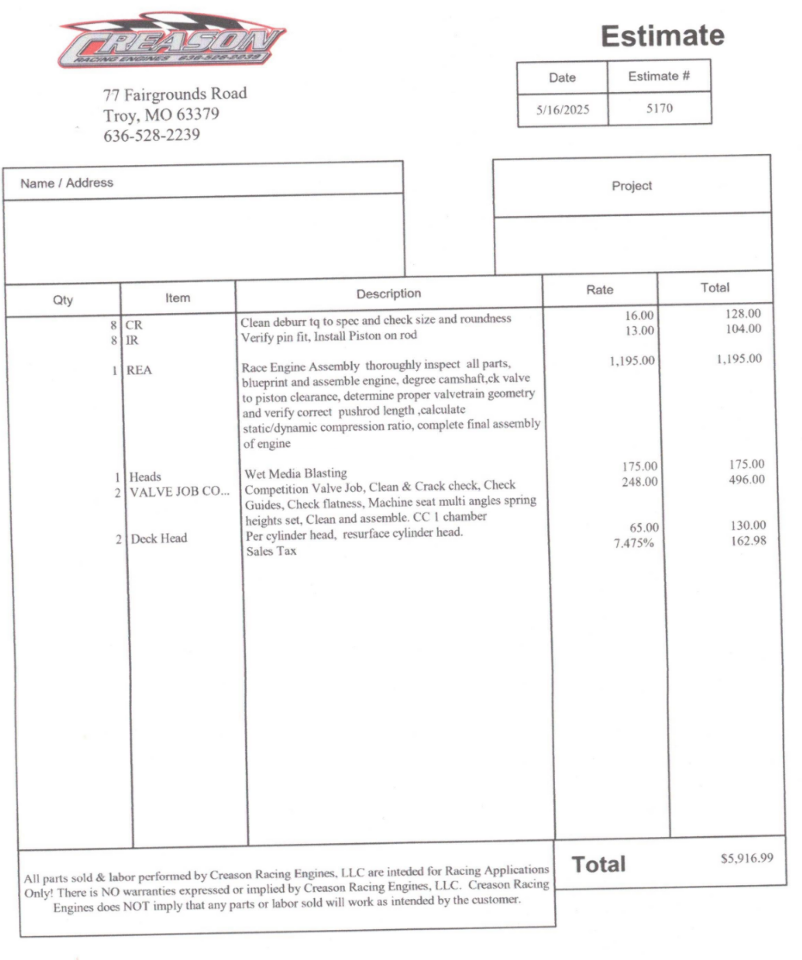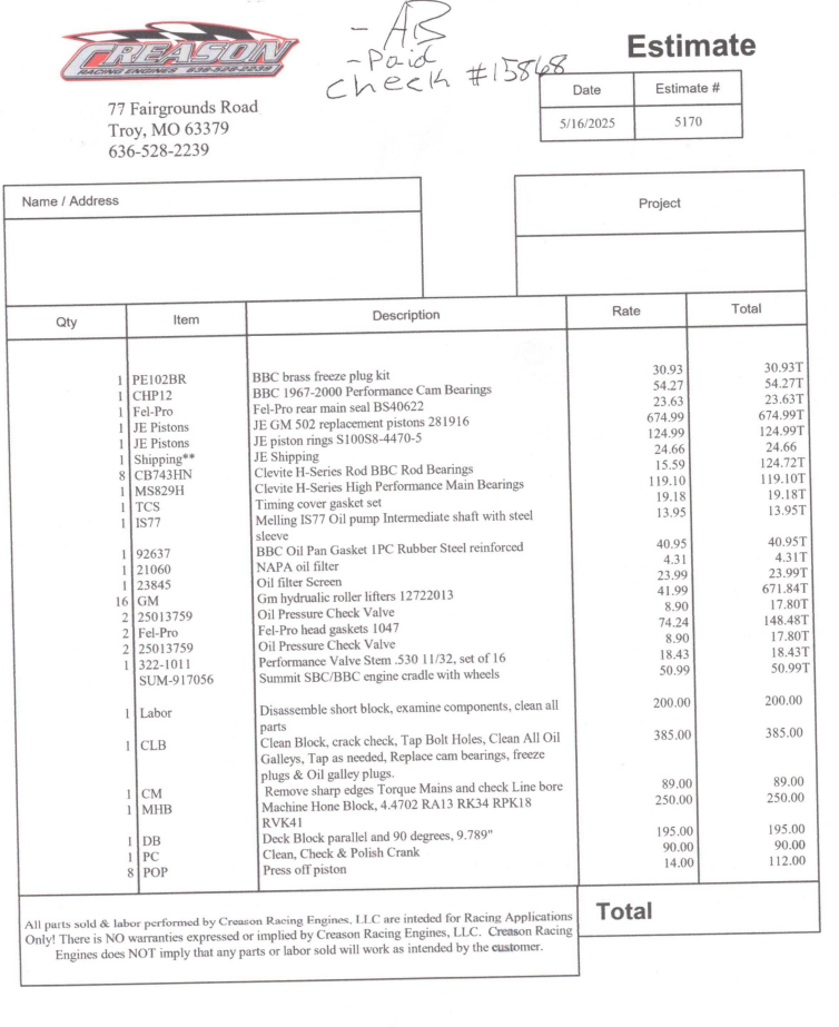 This is our ZZ502 Long block. We had this original ZZ502 (2015 original purchase from GM) rebuilt for a high end car build that we decided to go a different route (LS3 instead). This is a fresh professional rebuild by Creason Racing Engines of Troy, MO. Engine comes exactly as pictured. Please check out the photos, including the copies of the engine rebuild receipts.